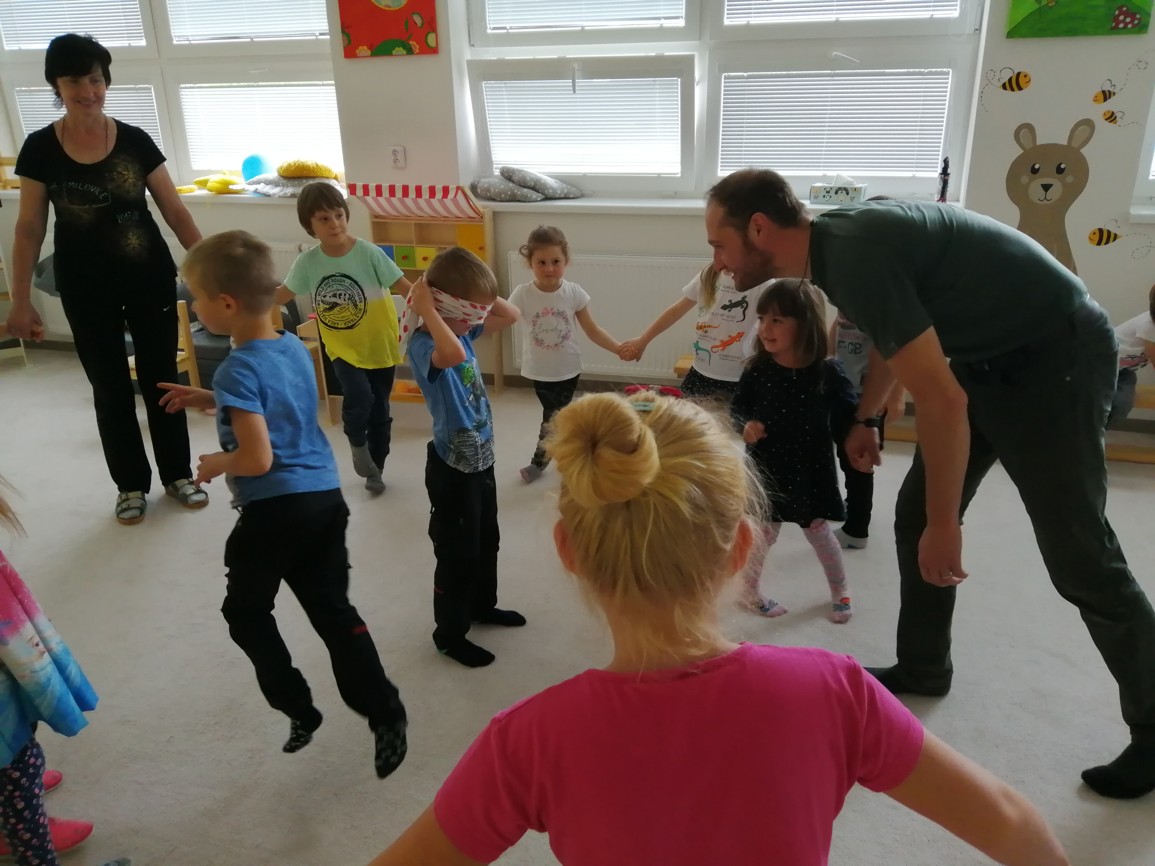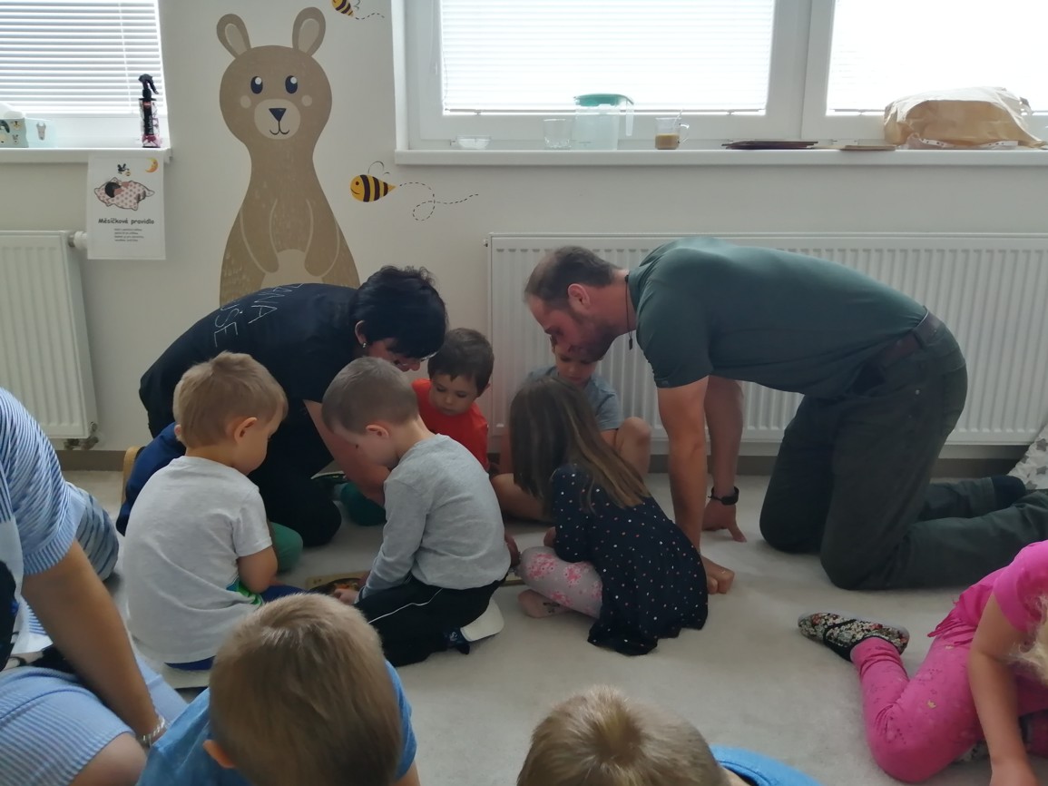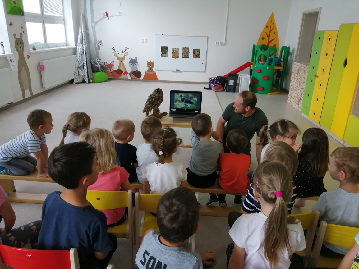 Seznámil děti s chráněným lesním ptactvem v našem blízkém okolí, ukazoval zajímavé obrázky, úkoloval děti ve vyhledávání v encyklopedii, také skládáním obrázků zvířat (dřevené puzzle) a nakonec si společně s dětmi zahrál zajímavou sluchovou hru.