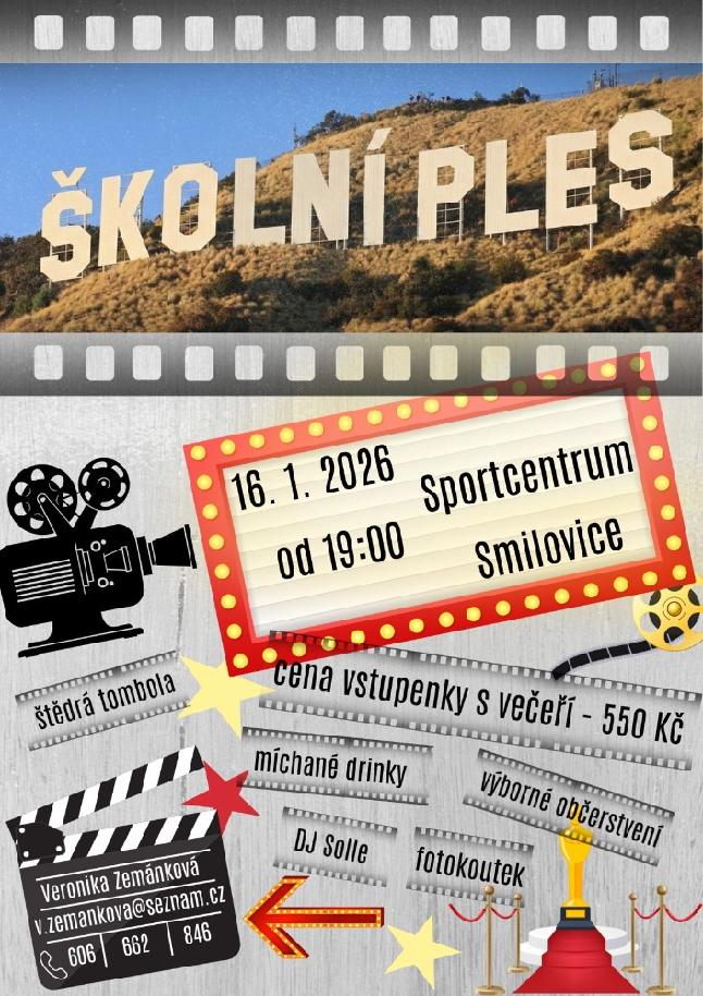 Srdečně Vás zveme na Školní ples, který se uskuteční dne 16. ledna 2026 ve Sportcentru Smilovice. Těšíme se na příjemné setkání, zábavu, hudbu a taneční večer s kolegy, rodiči a přáteli školy. Věříme, že si společně užijeme nezapomenutelný večer. Tématem letošního plesu je HOLLYWOOD.